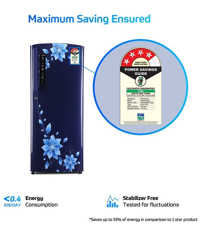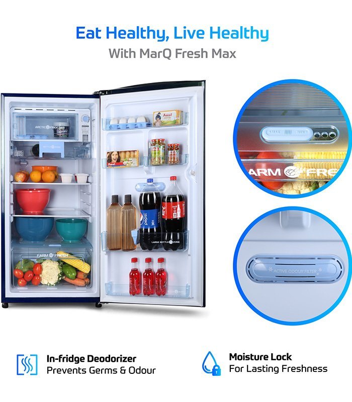 The MarQ by Flipkart 190 L single-door refrigerator comes with the best-in-class compressor with BEE 4 Star rating, giving you fast cooling and cold freezer temperatures of up to -24?C (under controlled ambient conditions and maximum settings) while being light on your pocket. Now you can open your refrigerator door multiple times without having to worry about cooling loss. It also comes with an in-built Deodorizer to prevent strong odours from mixing with your food, and a Cool-Booster that retains cooling for up to 9 hours during power cuts. The interiors have been thoughtfully designed to satisfy all the needs of an India family, along with features like Health Care Box, Large Bottle Bin, Egg Tray and Masala/Utility tray. The Spill-proof Tempered Glass Shelves and Removable Gasket offer further convenience for easy cleaning and hygiene. All this while ensuring maximum savings on energy consumption.