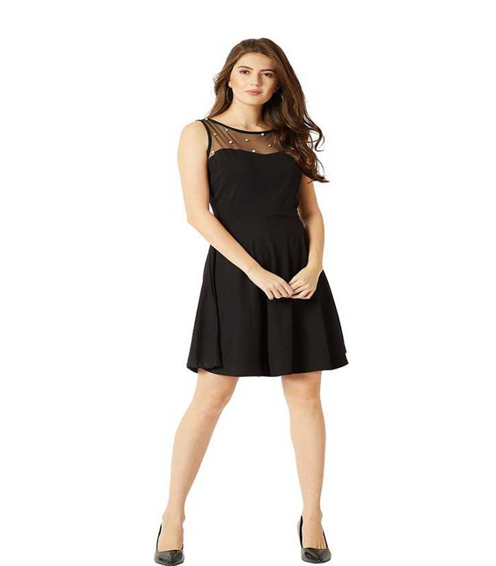 Black knitted cotton solid sheer and pearl detailing mini skater dress, Has a round neck and is sleeveless, Has a bow detailing at the back and a zip closure, Product Measurement -XS: Bust-31 Waist-24.5 Hip-35 -S: Bust-33 Waist-26.5 Hip-37 -M: Bust-35 Waist-28.5 Hip-39 -L: Bust-37 Waist-30.5 Hip-42 -XL: Bust-39 Waist-32.5 Hip-43