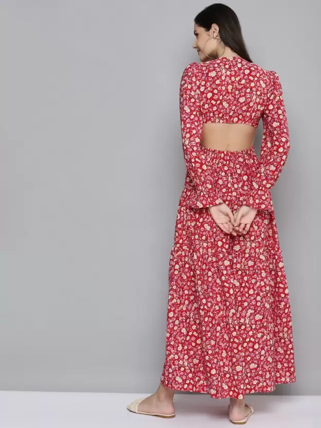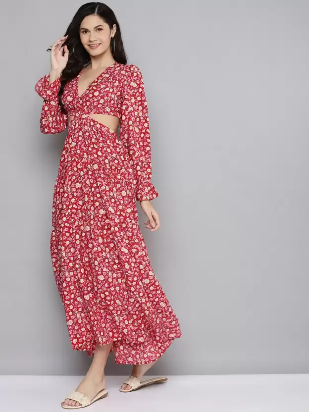 Red Ditsy Floral Waist Cut-Out Maxi Dress, in Rivera fabric, Unlined, Ankle Length , Fit & Flare, No Closure, Flared Hemline and features Cut-Out Detail