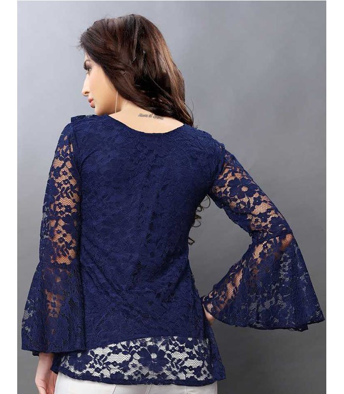 Navy Blue Semi Sheer Russel Net Top, has Ruffled Neck and Flared Sleeves
